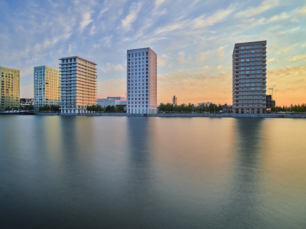Calm water Published 2024/01/02 at 1024 × 768 in Calm water High-rise buildings at the old inland port of Antwerp | © Jens Stachowitz sunset scene, long exposure time