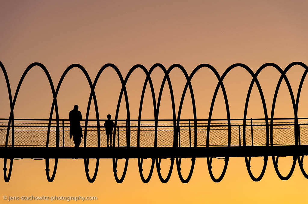 Inspired by the toy “Slinky” the german artist Thobias Rehberger designed a bridge in the form of a spiral with 496 arches made of aluminium and illuminated in the night. It spans the Rhine-Herne Canal in Oberhausen, Germany, connecting two public gardens, the Kaisergarten from the late 19th century and the Volksgarten from the early 20th century. The construction is held by two ribbons made of high strength steel and was developed by Schlaich, Bergermann & Partner. The elegant, light and vibrant bridge is part of the Emscherkunst and was build by the Emschergenosenschaft with subsidization by the European Union and the land North Rhine-Westphalia.